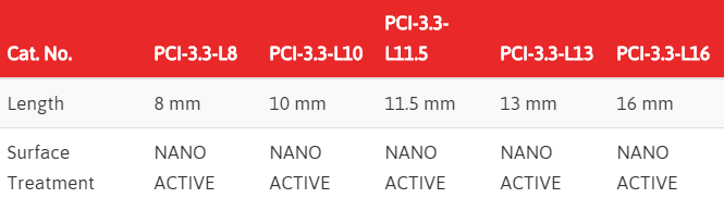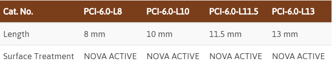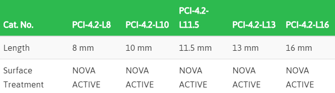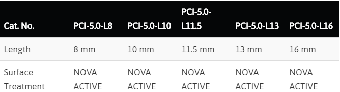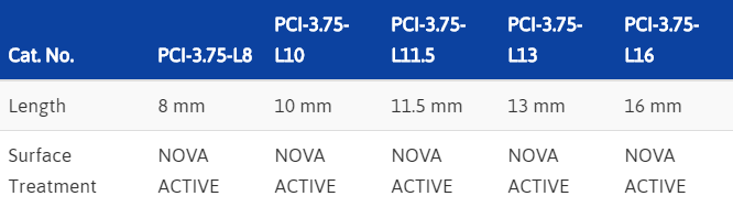 The Nova PCI implant is a straight wall 2.5 mm internal hex implant (standard) for both two-stage and single stage procedures. This design has a larger surface area that increases the bone to implant contact, resulting in more surface area for bone-cell attachment and interaction with the osteoblasts.